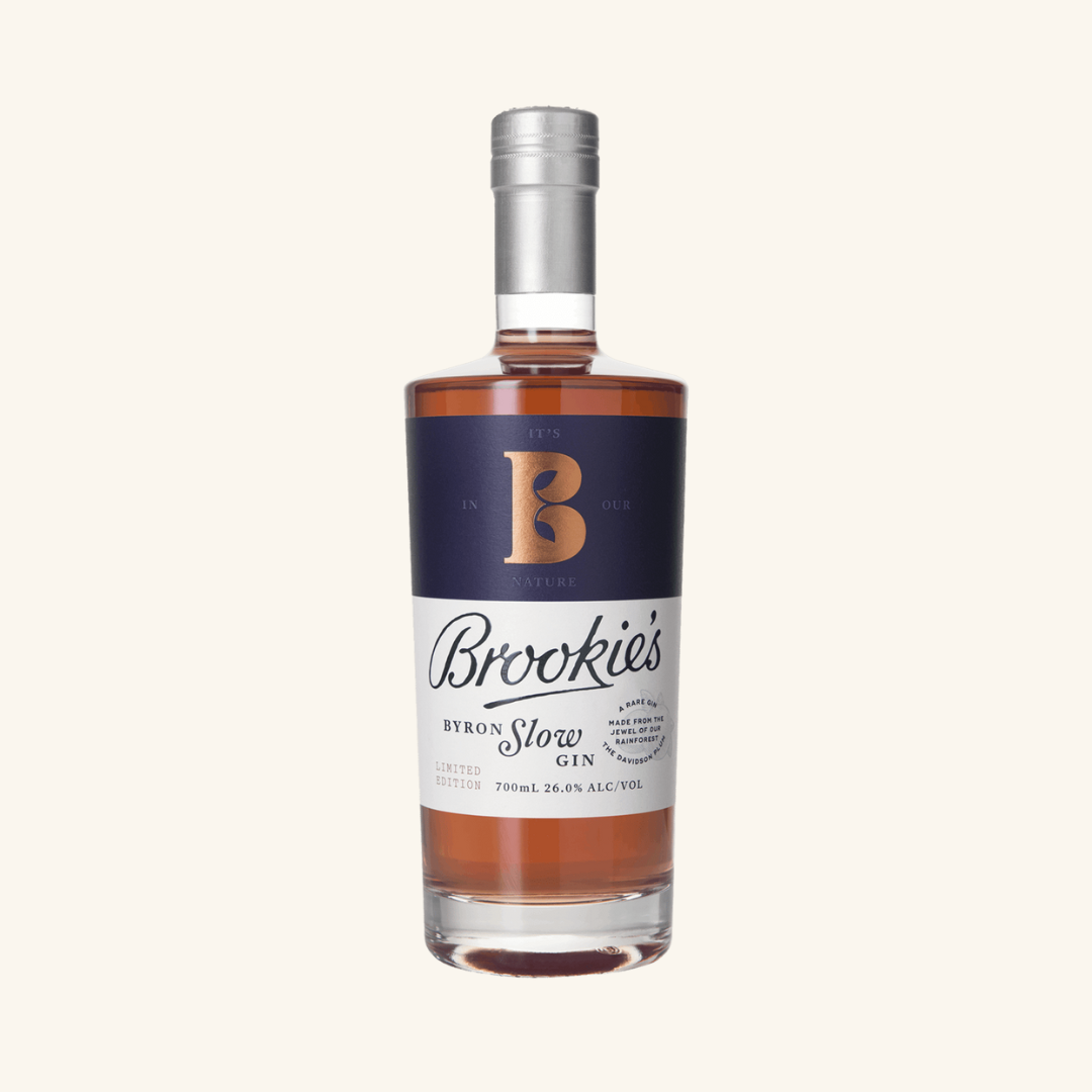 Brookie's Byron Slow Gin is a handcrafted Australian gin produced by Cape Byron Distillery in New South Wales. This unique gin captures the essence of the Byron Bay hinterland, where it is made with native botanicals including Davidson plum and Byron Sunrise Finger Lime, along with traditional gin botanicals like juniper and coriander.